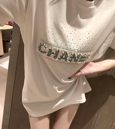 • [홍콩명품.CHANEL] 샤넬 24SS 로고 진주 장식 여성 반팔 티셔츠 (2컬러), BM13892, SG, 홍콩명품의류,구 매대행,온라인명품