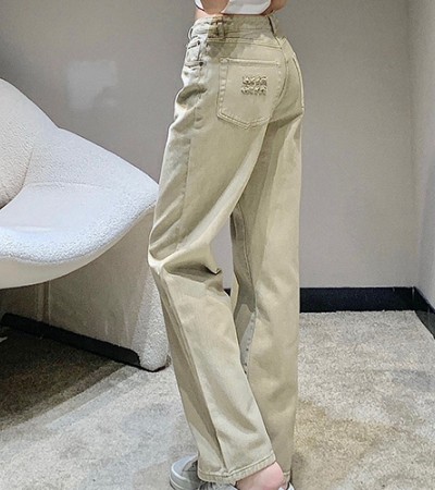 • [홍콩명품,MIU MIU] 미우미우 24SS 로고 자수 여성 오버핏 데님 팬츠 진 청바지 (베이지), BM16097, BR, 홍콩명품의류,구매대행,온라인명품