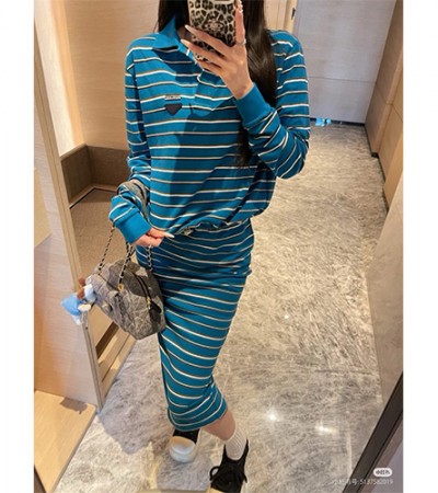 • [홍콩명품,PRADA] 프라다 25SS 로고 여성 스트라이프 카라 폴로 티셔츠 + 미디 스커트 상하의 세트 (2컬러), BM20165, KB, 홍콩명품의류,구매대행,온라인명품