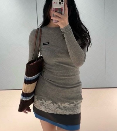 • [홍콩명품,MIU MIU] 미우미우 25SS 로고 여성 레이스 장식 긴팔 원피스 (그레이), BM20434, 13C, 홍콩명품의류,구매대행,온라인명품