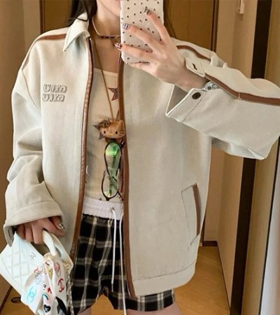 • [홍콩명품,MIU MIU] 미우미우 25SS 로고 데님 카라 집업 자켓 (베이지), BM22546, KB, 레플리카의류,미러급사이트