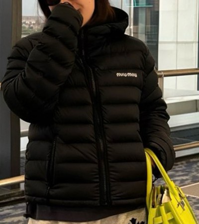 • [홍콩명품,MIU MIU] 미우미우 25SS 로고 자수 여성 후드 다운 패딩 자켓 (블랙), BM23344, KB, 레플리카의류,미러급사이트