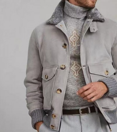 [홍콩명품.Brunello Cucinelli ] 브루넬로 쿠치넬리 25SS 로고 시어링 레더 가죽 봄버 자켓 (그레이), BM23818, TOM, 레플리카의류,미러급사이트 > 남자의류