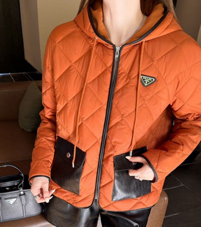 • [홍콩명품,PRADA] 프라다 25SS 삼각로고 여성 퀄팅 후드 솜패딩 자켓 (오렌지), BM23906, MC, 레플리카의류,미러급사이트