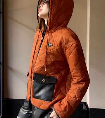 • [홍콩명품,PRADA] 프라다 25SS 삼각로고 여성 퀄팅 후드 솜패딩 자켓 (오렌지), BM24092, TBG, 레플리카의류,미러급사이트