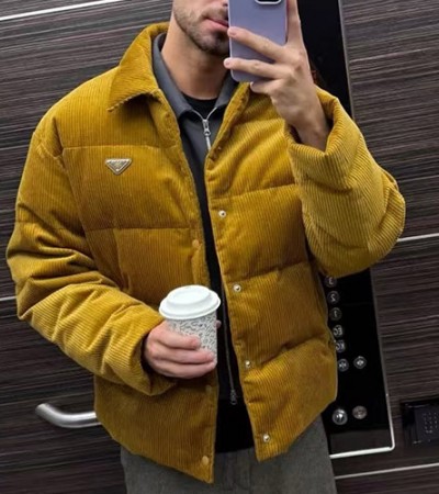 [홍콩명품,PRADA] 프라다 26SS 삼각로고 코드류이 골덴 카라 구스다운 패딩 자켓 (브라운), BM24658, JL, 레플리카의류,미러급사이트 > 남자의류