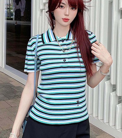 • [홍콩명품,Christian Dior] 디올 24SS 로고 여성 스트라이프 하프지퍼 슬림핏 쇼트 슬리브리스 니트 탑 (네이비), BM15571, TBG, 홍콩명품의류,구매대행,온라인명품