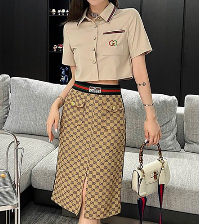 • [홍콩명품.Gucci] 구찌 23SS 로고 자수 쇼트 반팔 셔츠 + GG수프림 미디 스커트 상하의 세트 (2컬러), BM6763, TBG, 온라인명품쇼핑몰,의류,무브타임사이트,인터넷쇼핑몰,해외직구
