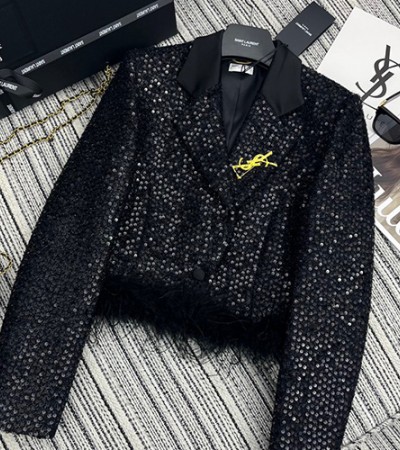 • [홍콩명품.YSL] 입생로랑 23SS 로고 스터드 장식 트위드 자켓, BM10243, TBG, 홍콩명품가방,명품쇼핑몰,크로스백,핸드백,구매대행,무브타임