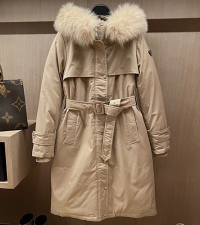 • [홍콩명품,PRADA] 프라다 23SS 삼각로고 여성 후드 벨티드 구스 다운 패딩 코트 자켓 (베이지), BM10960, KSM, 홍콩명품의류,구매대행,온라인명품