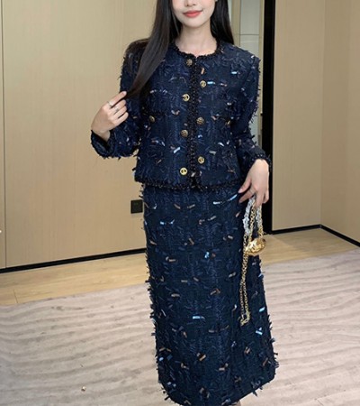• [홍콩명품.CHANEL] 샤넬 23SS 로고 트위드 자켓 + 미디 스커트 상하의 세트 (네이비), BM11285, TBG, 홍콩명품의류,구매대행,온라인명품
