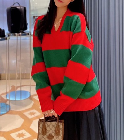 [홍콩명품.Gucci] 구찌 23SS 로고 스트라이프 V넥 니트 스웨터 (레드-그린), BM11297, TBG, 홍콩명품의류,구매대행,온라인명품 > 여성몰