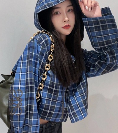 [홍콩명품.LOEWE] 로에베 24SS 로고 여성 체크 쇼트 후드 셔츠 자켓 (블루), BM11921, TBG > 여성몰