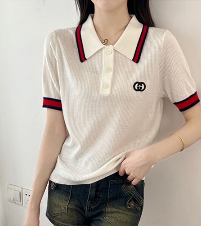 • [홍콩명품.Gucci] 구찌 24SS 로고 여성 슬림핏 니트 카라 반팔 티셔츠 (2컬러), BM13157, TBG, 홍콩명품의류,구매대행,온라인명품