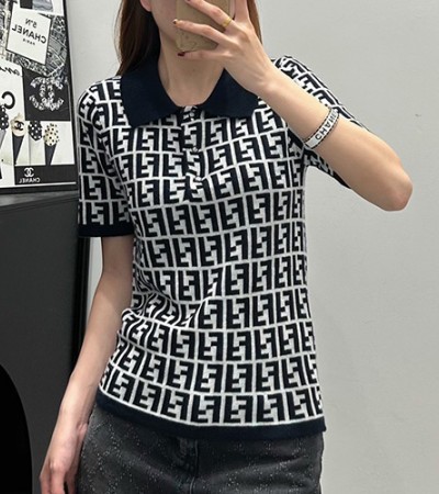 [홍콩명품,FENDI] 펜디 24SS 로고 FF패턴 여성 니트 폴로 반팔 티셔츠, BM14148, TBG, 홍콩명품의류,구 매대행,온라인명품 > 여성몰