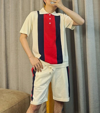 [홍콩명품.Gucci] 구찌 24SS 로고 스트라이프 카라 폴로 니트 반팔 티셔츠 + 쇼츠 반바지 상하의 세트 (아이보리), BM14381, JU, 홍콩명품의류,구매대행,온라인명품 > 남자의류