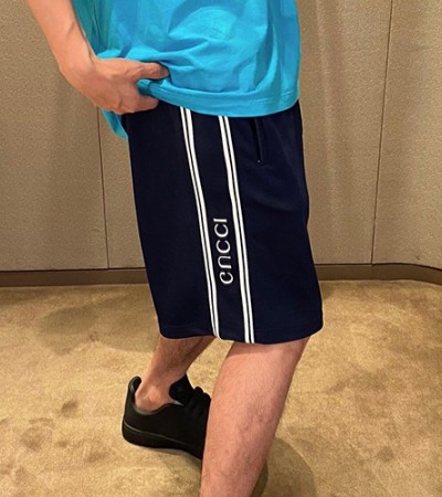 • [홍콩명품.Gucci] 구찌 24SS 로고 프린트 스트라이프 쇼츠 반바지 (네이비), BM14539, JL, 홍콩명품의류,구매대행,온라인명품
