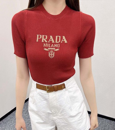 • [홍콩명품,PRADA] 프라다 24SS 로고 여성 슬림핏 니트 반팔 티셔츠 (레드), BM14806, TBG, 홍콩명품의류,구매대행,온라인명품
