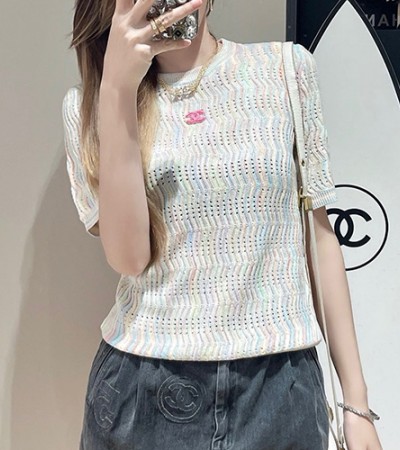 • [홍콩명품.CHANEL] 샤넬 24SS 로고 패턴 여성 니트 반팔 티셔츠, BM14894, TBG, 홍콩명품의류,구매대행,온라인명품