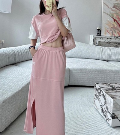 [홍콩명품,MIU MIU] 미우미우 24SS 로고 자수 여성 반팔 티셔츠 + 롱 스커트 상하의 세트 (2컬러), BM14927, SG, 홍콩명품의류,구매대행,온라인명품 > 여성몰