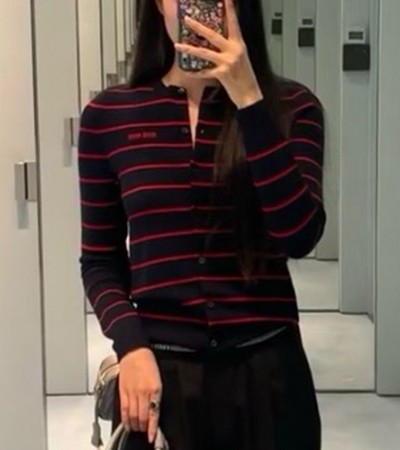 • [홍콩명품,MIU MIU] 미우미우 24SS 로고 여성 라운드넥 니트 가디건 (블랙-레드), BM15278, TBG, 홍콩명품의류,구매대행,온라인명품