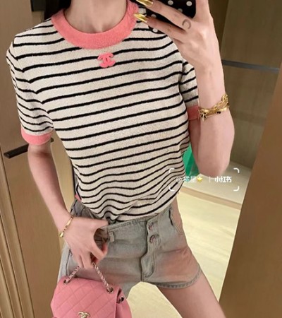 [홍콩명품.CHANEL] 샤넬 24SS 로고 여성 스트라이프 니트 반팔 티셔츠 (화이트-핑크), BM15291, TBG, 홍콩명품의류,구매대행,온라인명품 요약정보 및 구매