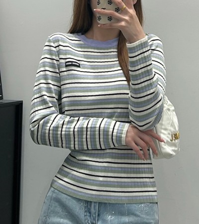 • [홍콩명품,MIU MIU] 미우미우 24SS 로고 여성 스트라이프 니트 스웨터, BM15585, TBG, 홍콩명품의류,구매대행,온라인명품