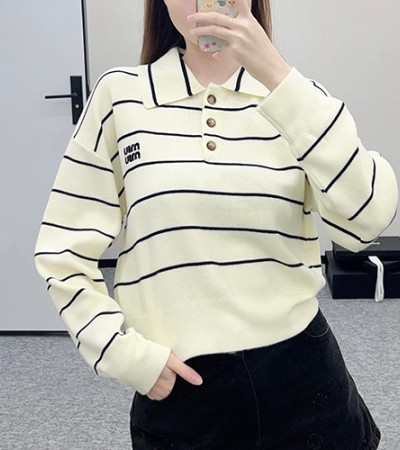 • [홍콩명품,MIU MIU] 미우미우 24SS 로고 여성 스트라이프 카라 니트 스웨터 (2컬러), BM15593, TBG, 홍콩명품의류,구매대행,온라인명품