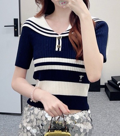 • [홍콩명품,Christian Dior] 디올 24SS 로고 스트라이프 여성 쇼트 니트 반팔 티셔츠, BM15965, TBG, 홍콩명품의류,구매대행,온라인명품