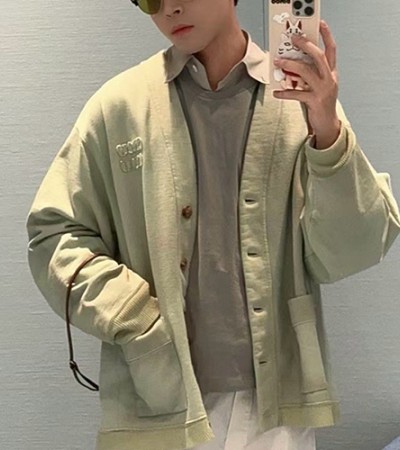 [홍콩명품,MIU MIU] 미우미우 24SS 로고 자수 V넥 가디건 자켓 (카키), BM16059, YS, 홍콩명품의류,구매대행,온라인명품 > 남자의류