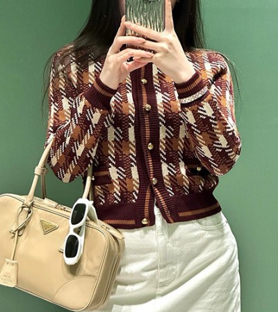 • [홍콩명품,PRADA] 프라다 24SS 로고 패턴 여성 라운드넥 니트 가디건 (브라운), BM16116, BR, 홍콩명품의류,구매대행,온라인명품