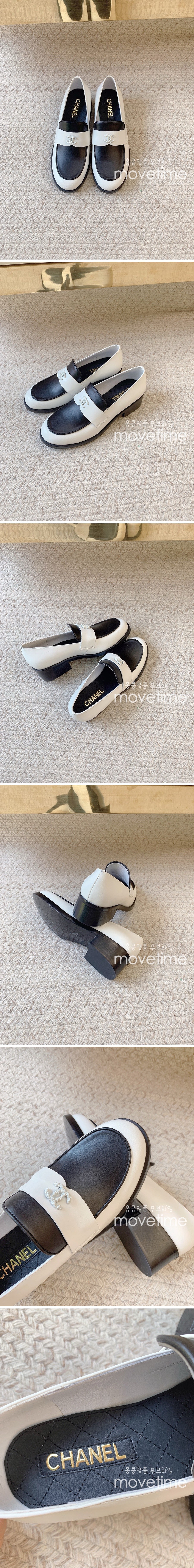 • [홍콩명품.CHANEL] 샤넬 24SS 로고 여성 레더 가죽 굽 구두 로퍼 (화이트-블랙), SE4119, ALW, 명품스니커즈,운동화,구두,로퍼,하이탑,신발