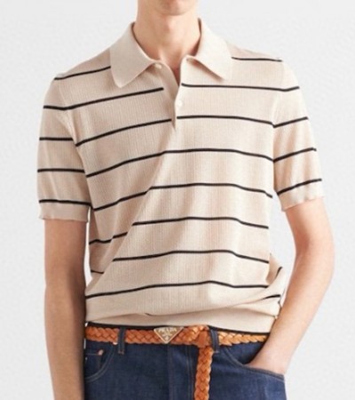 [홍콩명품,PRADA] 프라다 24SS 삼각로고 스트라이프 카라 폴로 반팔 티셔츠 (베이지), BM16242, JL, 홍콩명품의류,구매대행,온라인명품 > 남자의류
