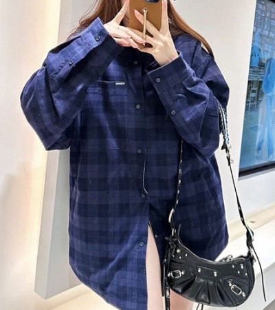 • [홍콩명품.BALENCIAGA] 발렌시아가 24SS 로고 체크패턴 울 남방 셔츠 (블루), BM16344, KB, 홍콩명품의류,구매대행,온라인명품