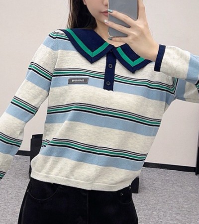 [홍콩명품,MIU MIU] 미우미우 24SS 로고 여성 스트라이프 카라 니트 스웨터, BM16460, TBG, 홍콩명품의류,구매대행,온라인명품 > 여성몰