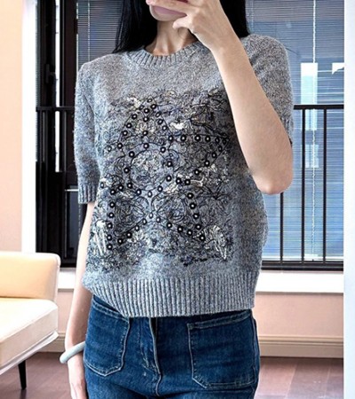 • [홍콩명품,Christian Dior] 디올 24SS 로고 그래픽 여성 캐시미어 니트 반팔 티셔츠 (그레이), BM16818, 홍콩명품의류,구매대행,온라인명품