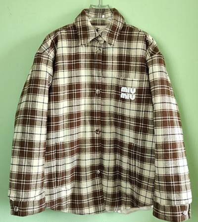 • [홍콩명품,MIU MIU] 미우미우 24SS 로고 자수 체크 패턴 울 남방 셔츠 (베이지), BM18001, JL, 홍콩명품의류,구매대행,온라인명품