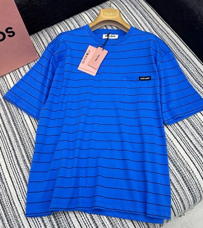 [홍콩명품,MIU MIU] 미우미우 25SS 로고 여성 스트라이프 반팔 티셔츠 (블루), BM19191, TBG, 홍콩명품의류,구매대행,온라인명품 > 여성몰