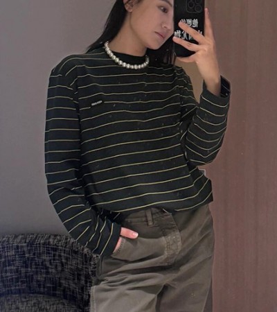 [홍콩명품,MIU MIU] 미우미우 25SS 로고 여성 스트라이프 긴팔 티셔츠 (그린), BM19370, TBG, 홍콩명품의류,구매대행,온라인명품 > 여성몰