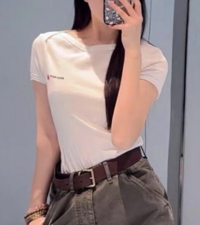 • [홍콩명품,MIU MIU] 미우미우 25SS 로고 자수 여성 반팔 티셔츠 (화이트), BM19589, 13C, 홍콩명품의류,구매대행,온라인명품