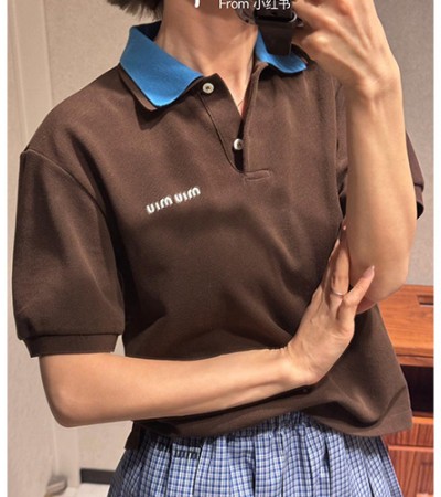 • [홍콩명품,MIU MIU] 미우미우 25SS 로고 자수 여성 카라 폴로 반팔 티셔츠 (브라운), BM19734, TBG, 홍콩명품의류,구매대행,온라인명품
