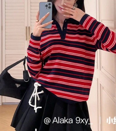 • [홍콩명품,PRADA] 프라다 25SS 로고 여성 스트라이프 카라 긴팔 티셔츠 (네이비-레드), BM19835, 13C, 홍콩명품의류,구매대행,온라인명품