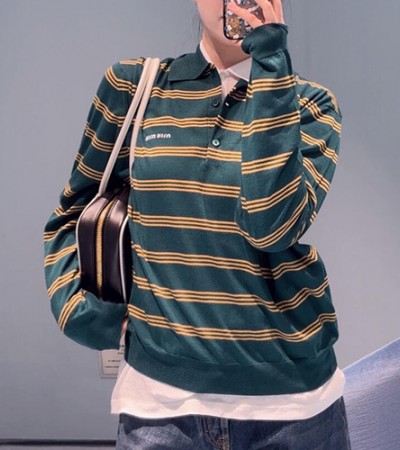 • [홍콩명품,MIU MIU] 미우미우 25SS 로고 여성 스트라이프 카라 긴팔 티셔츠 (그린), BM19843, 13C, 홍콩명품의류,구매대행,온라인명품