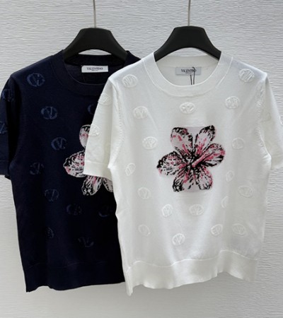 • [홍콩명품.Valentino] 발렌티노 25SS 로고 여성 플라워 패턴 니트 반팔 티셔츠 (2컬러), BM20593, GBG, 홍콩명품의류,구매대행,온라인명품