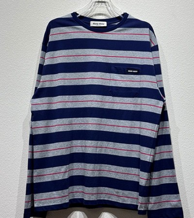 [홍콩명품,MIU MIU] 미우미우 25SS 로고 여성 스트라이프 긴팔 티셔츠 (네이비-그레이), BM20766, KB, 홍콩명품의류,구매대행,온라인명품 > 여성몰