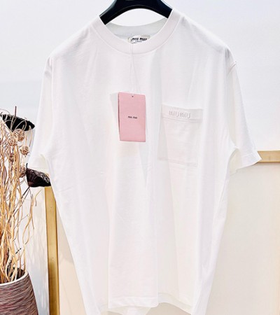• [홍콩명품,MIU MIU] 미우미우 25SS 로고 자수 반팔 티셔츠 (2컬러), BM21505, YS, 명품레플리카,미러급,온라인쇼핑몰사이트