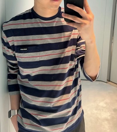 [홍콩명품,MIU MIU] 미우미우 25SS 로고 스트라이프 반팔 티셔츠 (네이비-그레이), BM21507, JL, 명품레플리카,미러급,온라인쇼핑몰사이트 > 남자의류