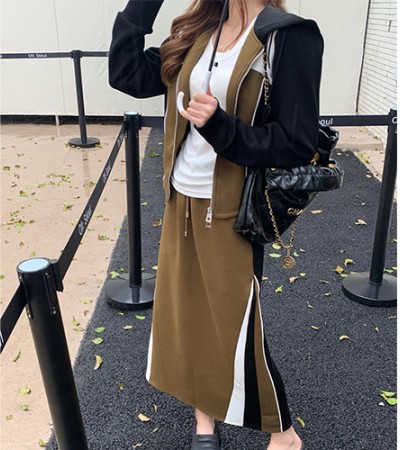 • [홍콩명품.LOEWE] 로에베 25SS 로고 여성 후드 집업 자켓 + 미디 스커트 상하의 세트 (카키), BM21809, COCO, 레플리카의류,미러급사이트