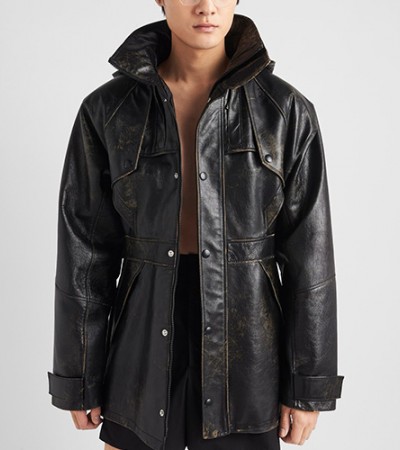 • [홍콩명품,PRADA] 프라다 25SS 로고 레더 가죽 후드 코트 자켓 (블랙), BM22381, TOM, 레플리카의류,미러급사이트