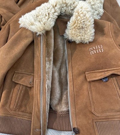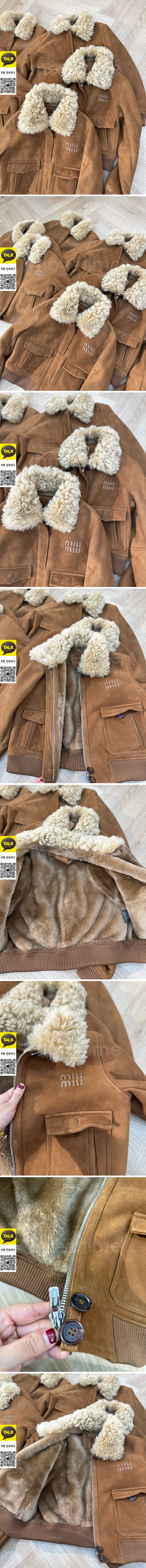 • [홍콩명품,MIU MIU] 미우미우 25SS 로고 레더 가죽 시어링 봄버 자켓 (브라운), BM22806, TOM, 레플리카의류,미러급사이트